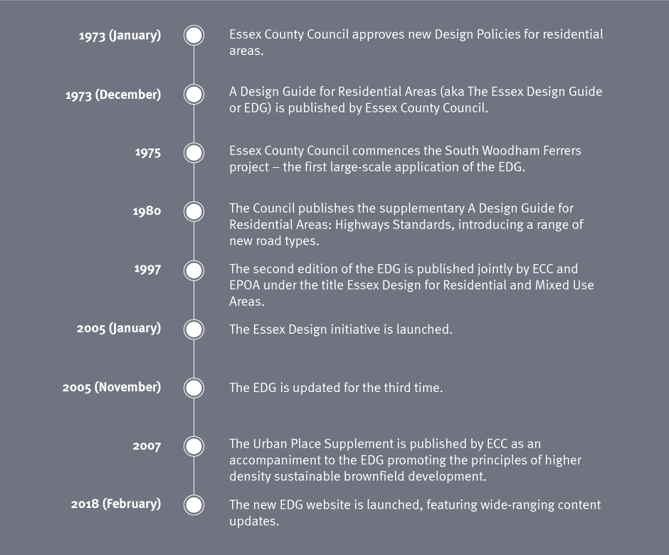 The Essex Design Guide (EDG) for Residential Areas was first published by Essex County Council (ECC) in 1973. Since its initial publication and through subsequent revisions (1997 and 2005) the document has guided development in Essex for almost 45 years. Published initially by ECC, later revisions of the EDG have been produced collaboratively with the Essex Planning Officers' Association (EPOA) including this 2018 edition.