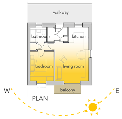 - Bedrooms should be avoided on the West elevations, because these receive solar gain at the end of the day, just before they are occupied, so carry a high risk of overheating.