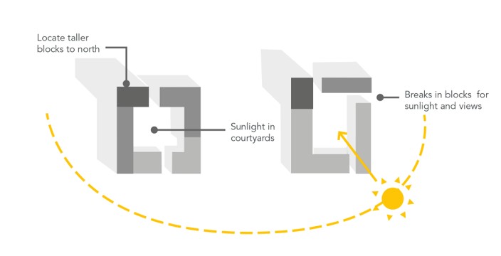 It is best practice to avoid placing higher elements to the south of a site, ideally these should be placed to the north to avoid excessive shading of other buildings and external amenity spaces. Consideration should also be given to surrounding buildings off site. Allow strategic breaks in building massing to let sunlight in. When designing for sunlight consider the suns angle at different times of the day across different seasons.