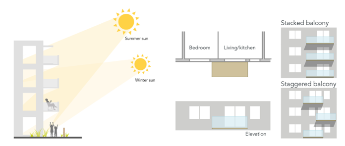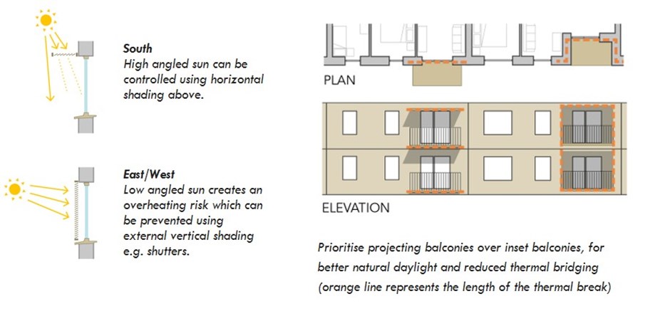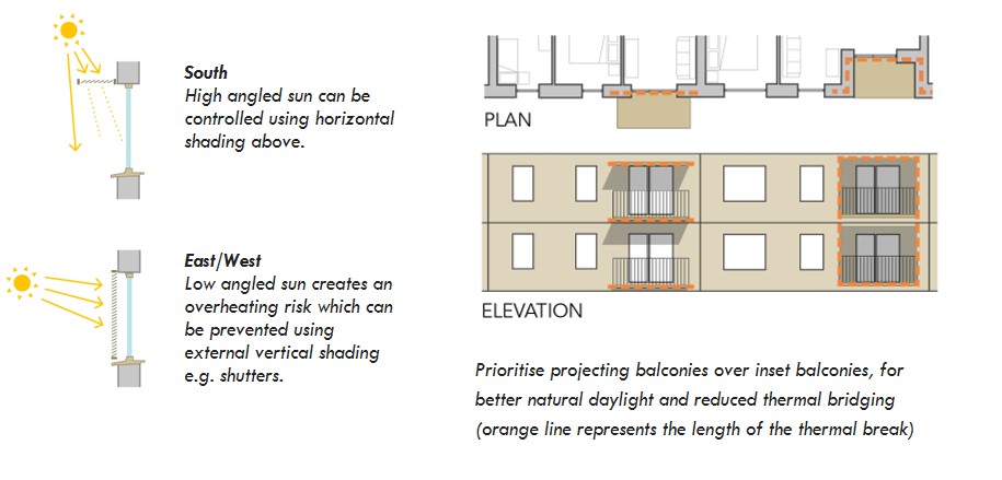 Balconies offer a similar opportunity to shade South facing windows. A preference should be made for stacked projecting balconies, as inset balconies have higher levels of thermal bridging and can create dark, dimly lit rooms. For top floor balcony windows, where there is no balcony above, a canopy or brise soleil should be considered.