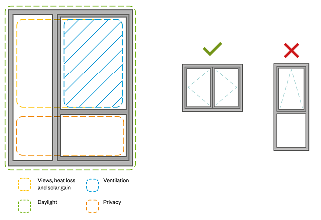 - Consider what portion of the window is useful for daylight, solar gain, ventilation, privacy and views.