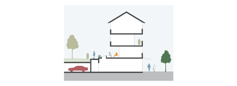 This arrangement requires less site excavation but imposes constraints upon building design at ground level. Ground-floor uses have only a single aspect towards the street and consequently the amount of daylight penetrating the space through the depth of the building is limited. However, the ground floor in this arrangement is very suitable for commercial uses, which can take advantage of the flexible depth the parking area provides to the rear. For retail uses, the space at the back of the shop would be situated under, and ventilated through, the deck above.