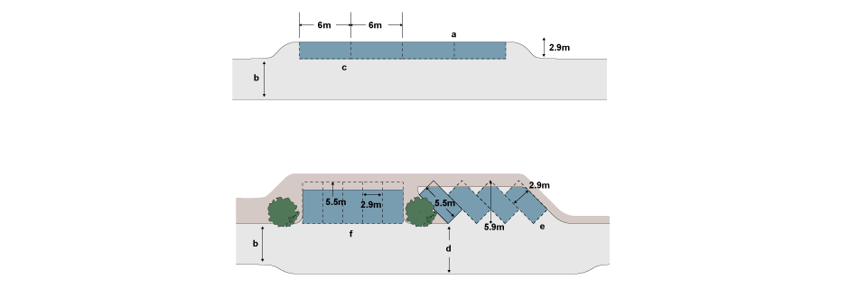 Where spaces are at an angle to the kerb the footway should be widened by 800mm to accommodate vehicle overhang. Such groups of spaces will be adopted, but should be limited in size and number so as not to dominate visually.