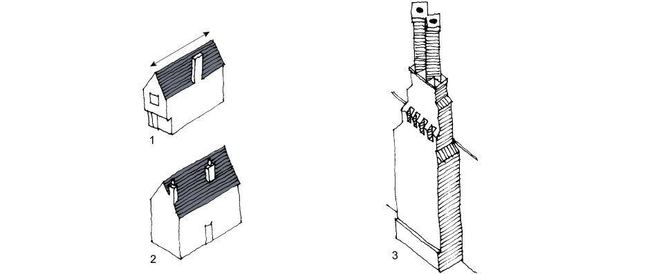 They should be positioned on the ridge line of the roof, centrally on a gable end or against an outside wall, and should have pots. In the case of small dwellings without fireplaces, gas flues or soil and vent outlets can be combined into chimney structures.