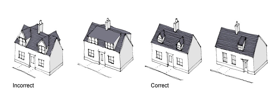 Dormers in new housing are often the result of an attempt to provide habitable accommodation within the roof space. This makes them over-dominant in the composition. It is often preferable to include this accommodation within the main volume of the house by raising the eaves level. Dormers should be a minor incident in the roof plane. Their purpose should be to light the roof-space, not to gain extra headroom over any great width. They should not be located close to verges or hips and should have gabled, cat-slide or flat lead roofs. Rooflights should be used sparingly. They should appear on rear elevations only and not in conjunction with dormers.
