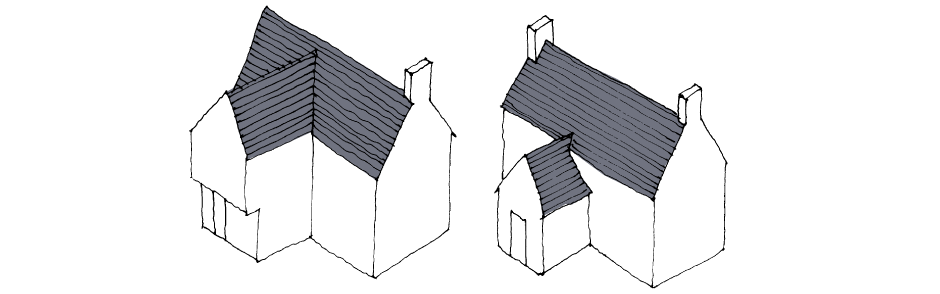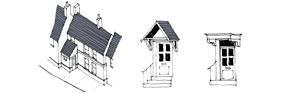 Open porches and hoods are preferable to and easier to assimilate than enclosed porches. A pitched-roof porch should project from the building by at least the width of its span – though obviously this could prove a cumbersome element on a small elevation.