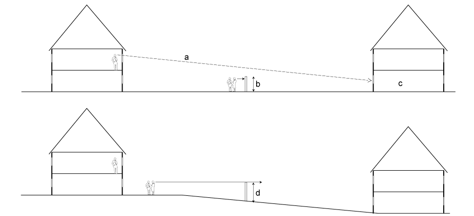 The rears of houses may be positioned more closely together than stipulated above if one or both of the houses concerned is designed so as not to overlook the other. This would require an intervening fence or other visual barrier set above eye-level between facing ground-floor windows. It would also prohibit rear-facing, upper-storey bedroom or living room windows.