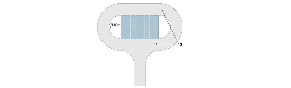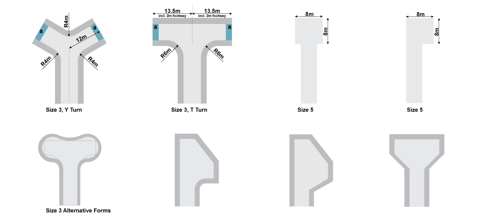 On type G roads of less than 20m in length, a size 5 turning head will be required. In all other circumstances, a size 3 turning head will be sufficient. This is adequate for turning fire and rescue tenders and pantechnicons. The shaded areas in the accompanying diagrams are required for vehicle overhang and must be included as part of the highway. These can form all or part of a footway, but should be adopted highway.