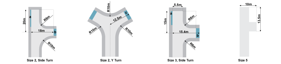 On type E, F and G roads that comprise side turnings from type D, E, F or G roads, and which are less than 20m in length excluding the turning head, a size 4 turning head may be used.