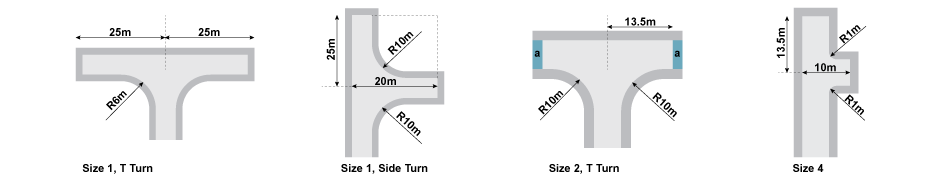 Any cul-de-sac system off a type A or higher category road is to provide a turning head of not less than size 2 dimensions. This may be contained within the first road junction off the cul-de-sac. Where very large vehicles are likely to frequent the system, it may be necessary to incorporate a size 1 turning bay.
