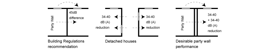 The Building Regulations recommend various forms of party wall and flooring which, when tested, achieve a minimum weighted standardised noise level difference (DnTW+ Ctr) of 45dB between neighbouring premises.
