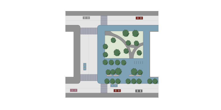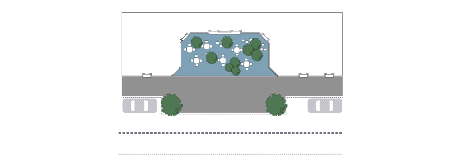 For example, a wider space may have a higher proportion of soft or planted surface area, as otherwise the space would be dominated by a monotonously large expanse of paving. A tighter, more enclosed space may be hard-paved without creating the same negative effect.