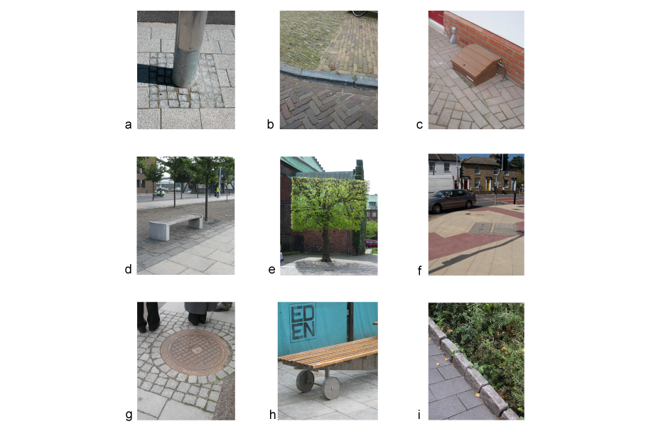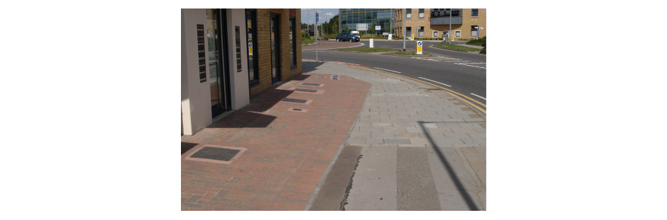 - Junctions between materials, kerbs and crossings and changes in direction of paving