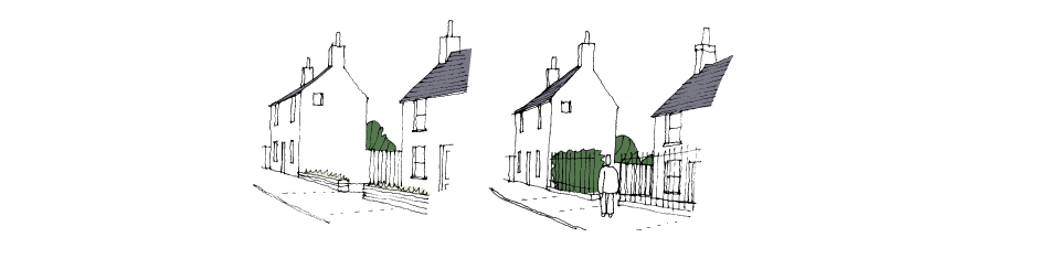 Houses that are set back with ‘open plan’ front gardens and wide windows offer less privacy from the street, particularly if they have a through living room where daylight from the rear silhouettes figures in the room. It is therefore recommended that designers return to the traditional format of vertically proportioned windows and houses either set forward to the rear edge of the footway or, exceptionally, set back behind front gardens hedged or walled to above eye-level. This accords with good practice in the creation of a townscape and the enclosure of space.
