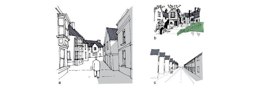 This principle can be witnessed in many historic settlements. In some, for example, spaces, forms, roof pitches and eaves vary, while a pleasing unity is imparted by consistency of materials and elevational openings. Other settlements owe their character to a variety of materials combined with consistent street frontage and plot widths.