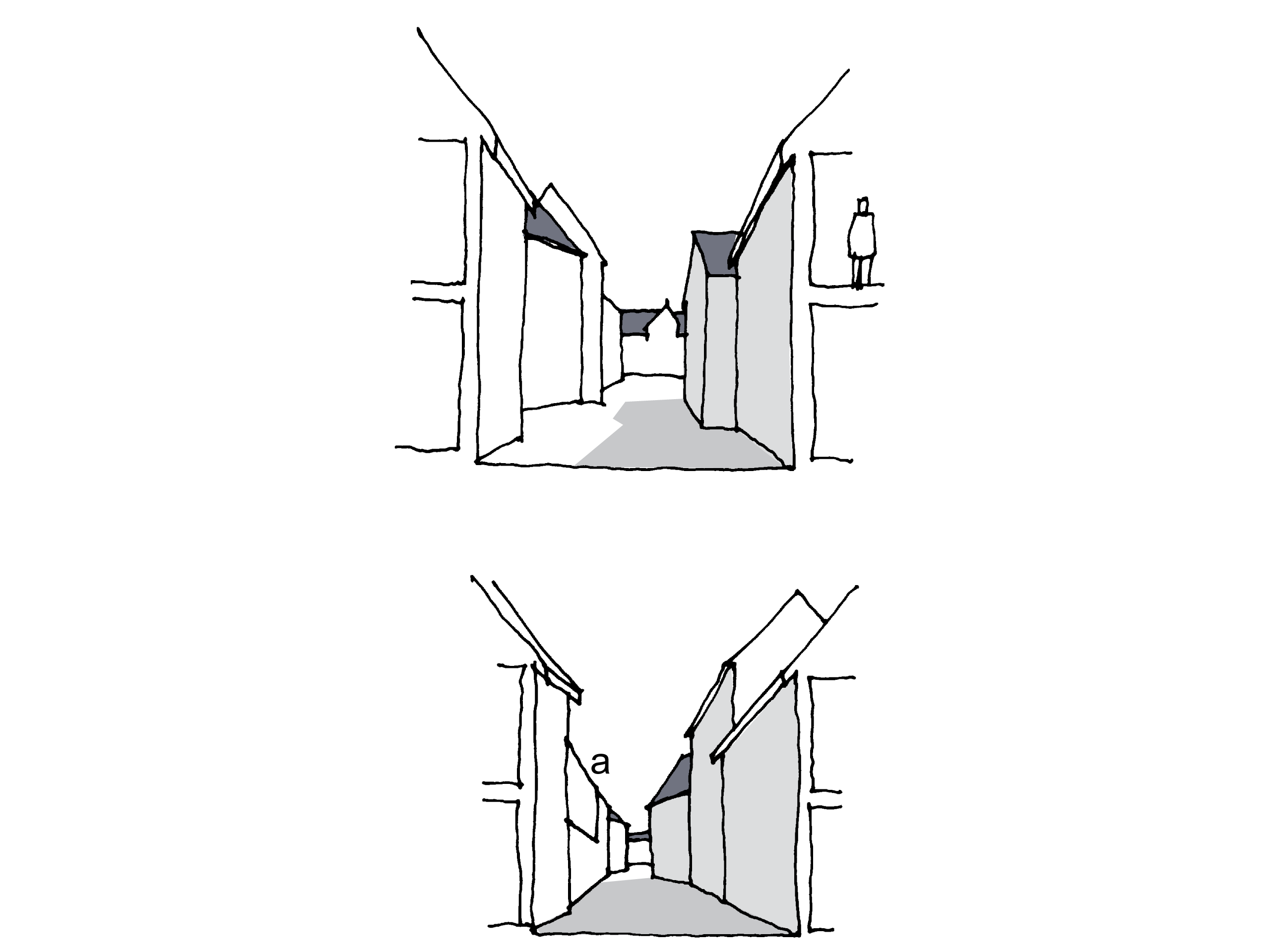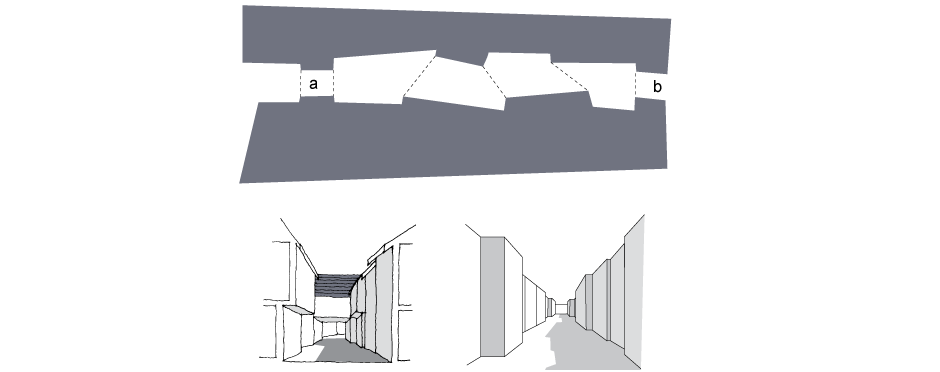 Most urban spaces are inevitably linear and corridor-like in form, contained by buildings and other features. If pedestrians were the only element requiring accommodation, spaces would not need to be wider than 2m, but the requirements of building outlook and vehicle manoeuvring generally preclude such intimate spaces. Typically, the narrower, longer and taller the enclosing buildings of such a space, the greater the sense of dynamic movement it imparts.