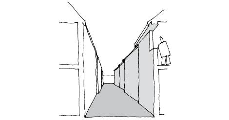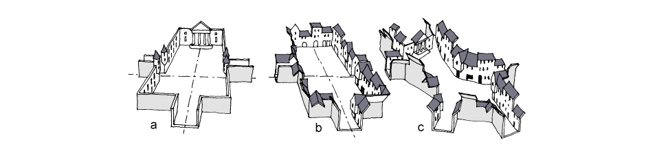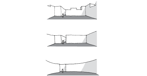 An over-long linear space can be daunting or monotonous to the pedestrian, as too much is revealed at once. This problem may be overcome by limiting a space’s visual length using the complete or partial closure offered by a taller terminal building, a curve in the street, a change in the building line, a pinch point or a change in level. These devices conceal the way ahead and arouse the curiosity of the pedestrian. They also reduce the dynamism of the space.