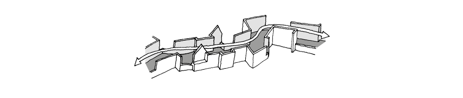 The route should be a unifying element, tying groups of buildings together and making its whole length a composition in itself. However, such a route will still require a variety of spaces along its length if it is to provide satisfactory diversity of spatial experience.