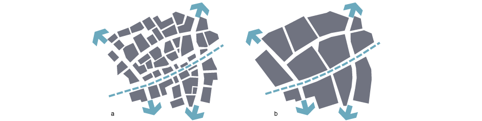 This has altered what once may have been a fine-grained pattern of streets and paths into a coarse-grained pattern. Despite these changes, the urban grain is likely to be (and needs to be) finest near the centre of a town or neighbourhood. This is where the greatest intensity of movement occurs and where the richest pattern of uses can usually be found. Away from the commercial heart of the town or neighbourhood the grain can be coarser, which reflects the less intense demands on movement and agglomeration.