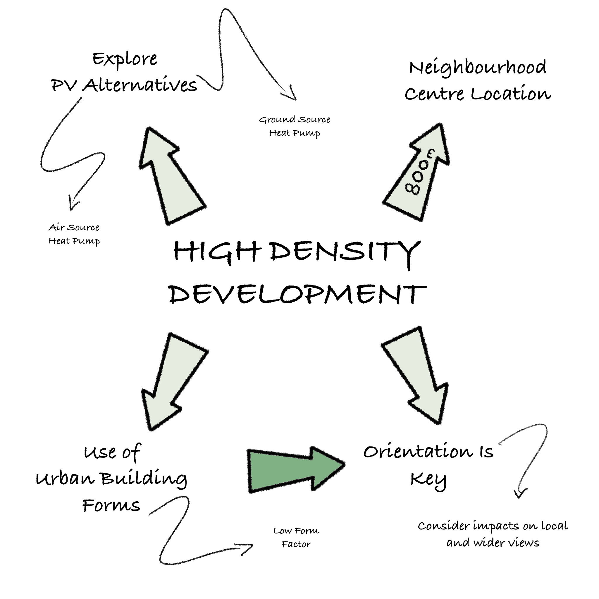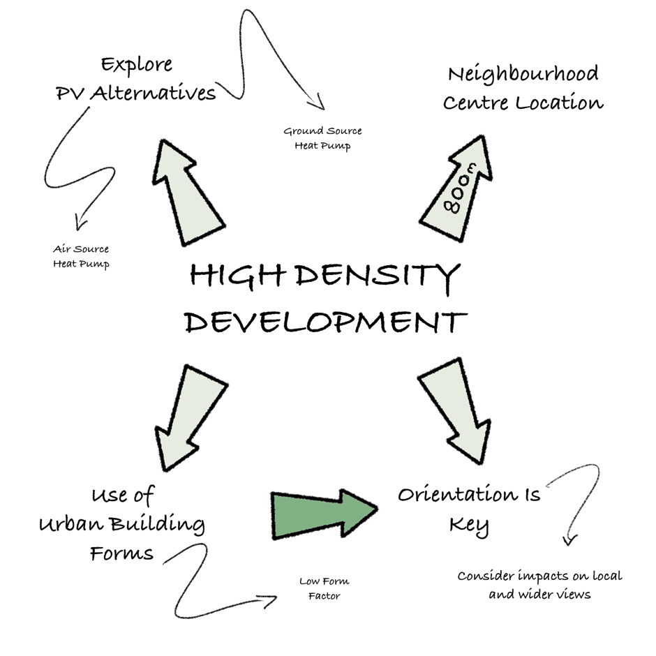 Higher density developments will also have limitations on how orientation will help benefit sustainability when using PV. In these instances, other emerging technologies such as ground and air source heat pumps could be alternatives to explore.