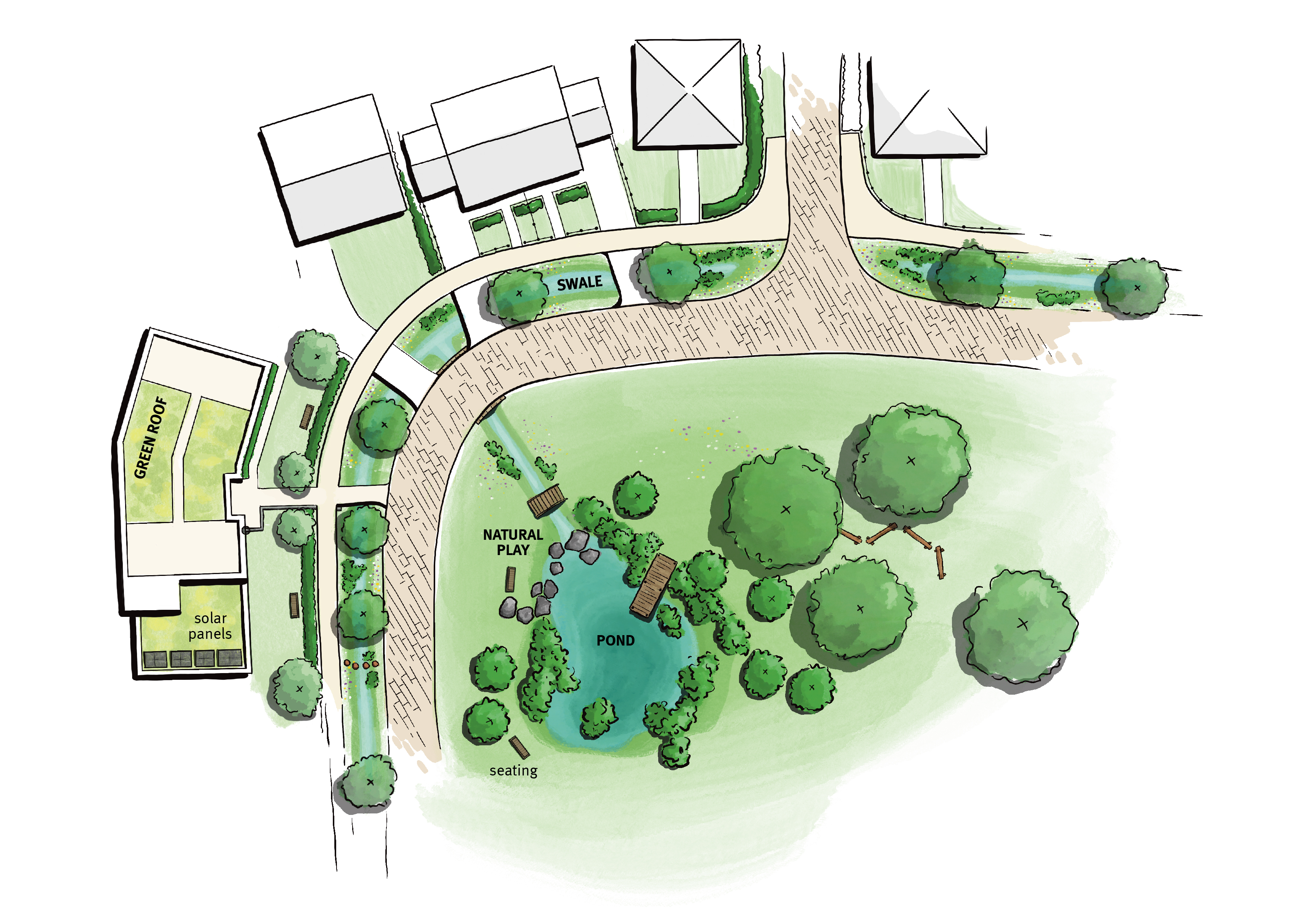 - SuDS features can incorporate mini water wheels, water shoots and engaging water sculptures that support play and child led learning.