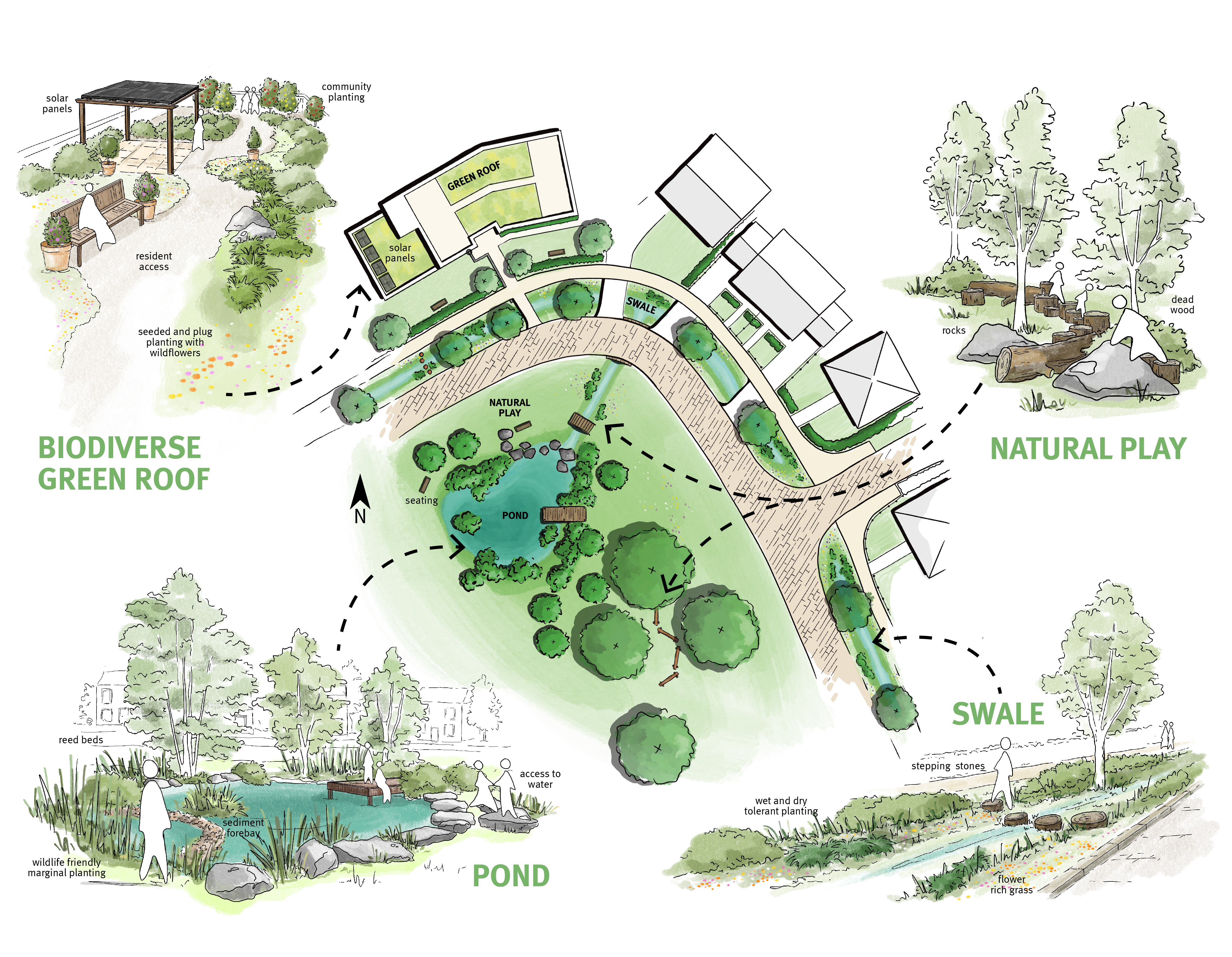 The aim of biodiversity in relation to SuDS is to protect local habitats and species, contribute to habitat connectivity and create diverse, self-sustaining, and resilient ecosystems (The CIRIA SuDS Manual C753, Table 6.1). Water managed on the surface can provide habitat for flora and fauna, and therefore increase and enrich biodiversity. Generally, by keeping water on the surface, the costs are less than when compared with the installation cost of conventional drainage systems.