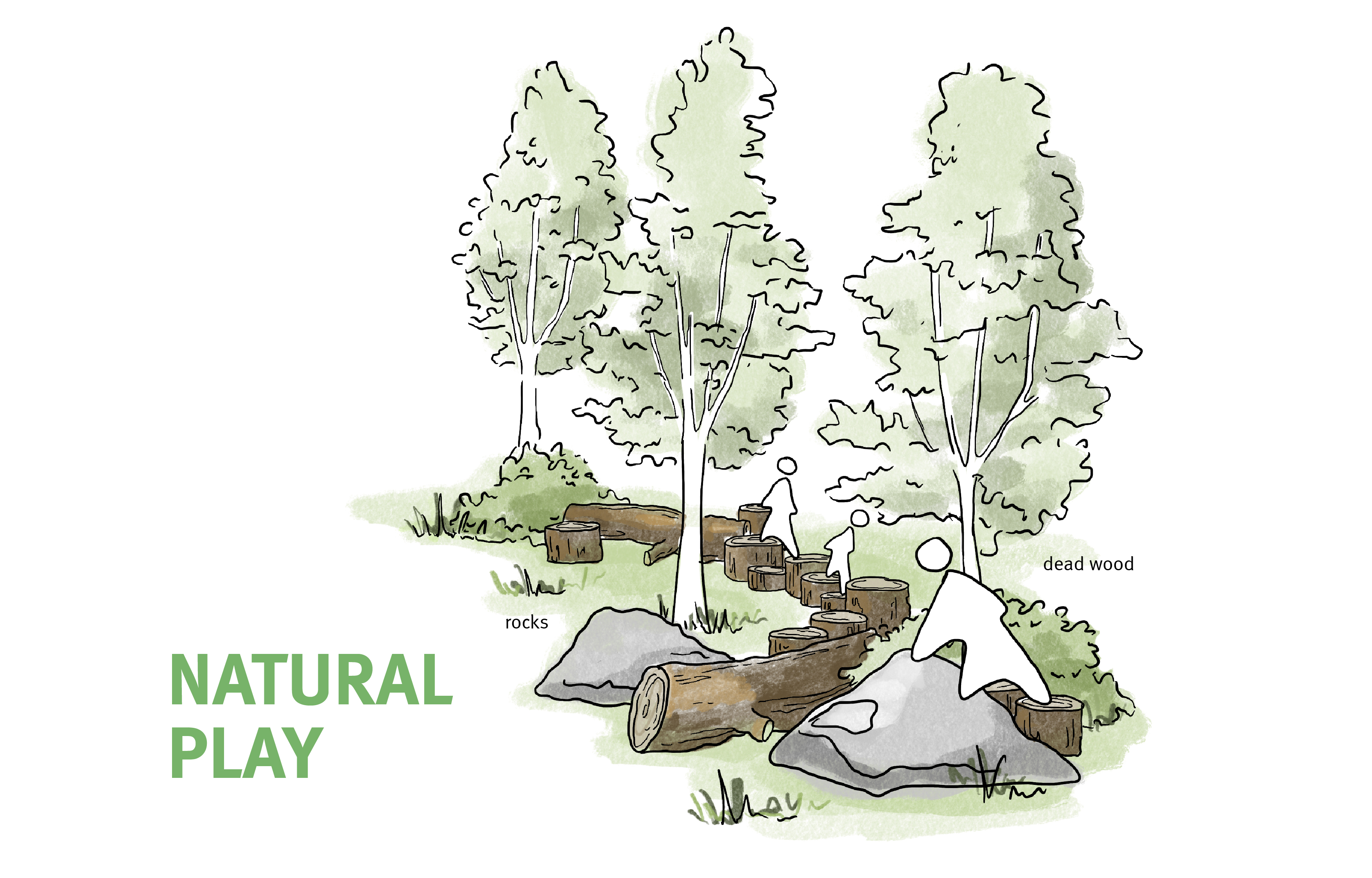 - Maximising opportunities for providing or retaining dead wood in dry or wet areas. Dead wood can be used for steppingstones and for the creation of bridges for children's play.