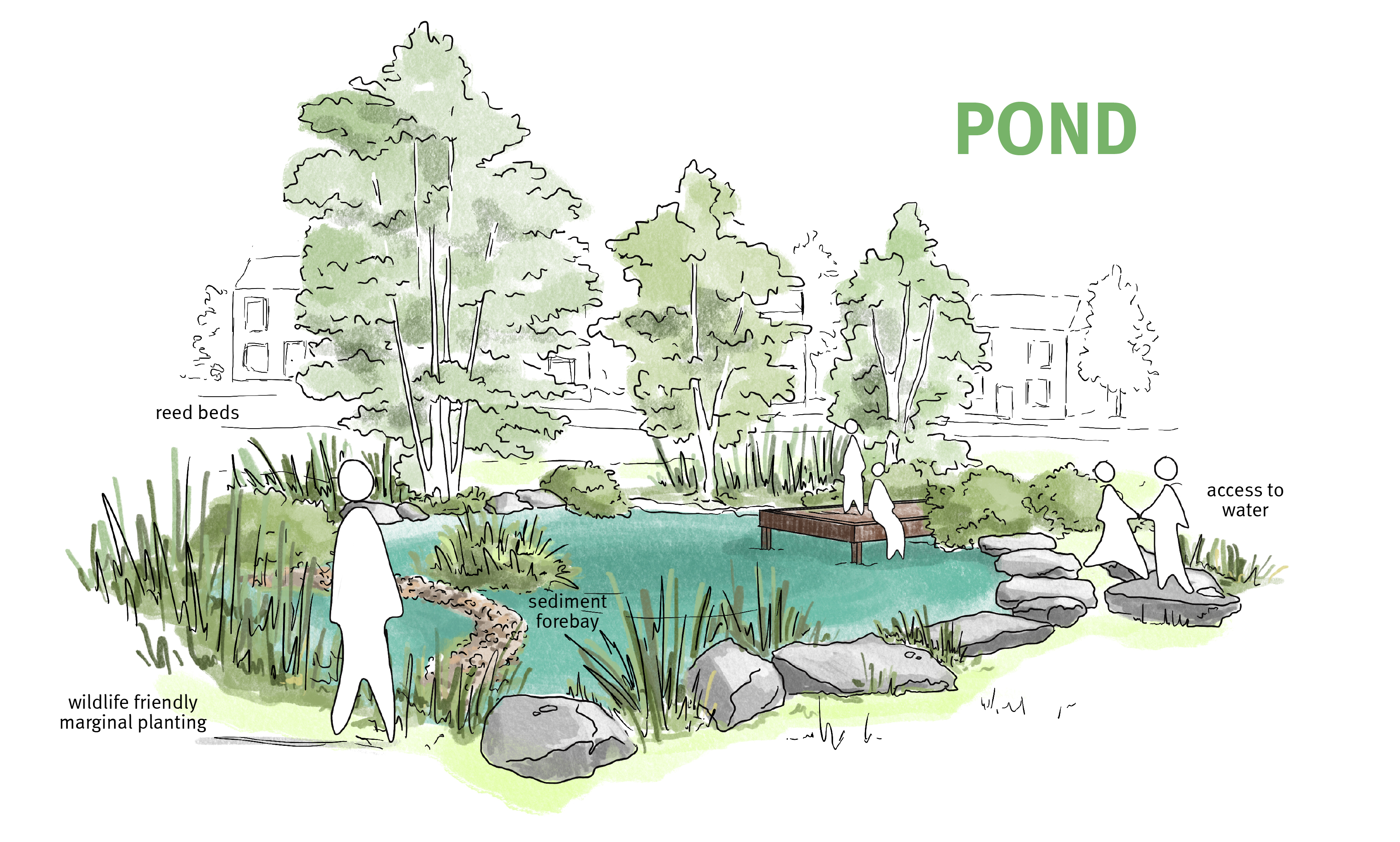 - Incorporation of a range of vegetation types including mosaics of marginal planting and grasses of various heights to act as a natural edge barrier. Reed beds provide further filtration. Dense vegetation can be considered on the side slopes to discourage wildfowl use. Where wildfowl use is to be encouraged, “bays” and breeding “islands” can be integrated into the shape of larger ponds. Trees and shrubs can be considered to create lightly shaded areas.