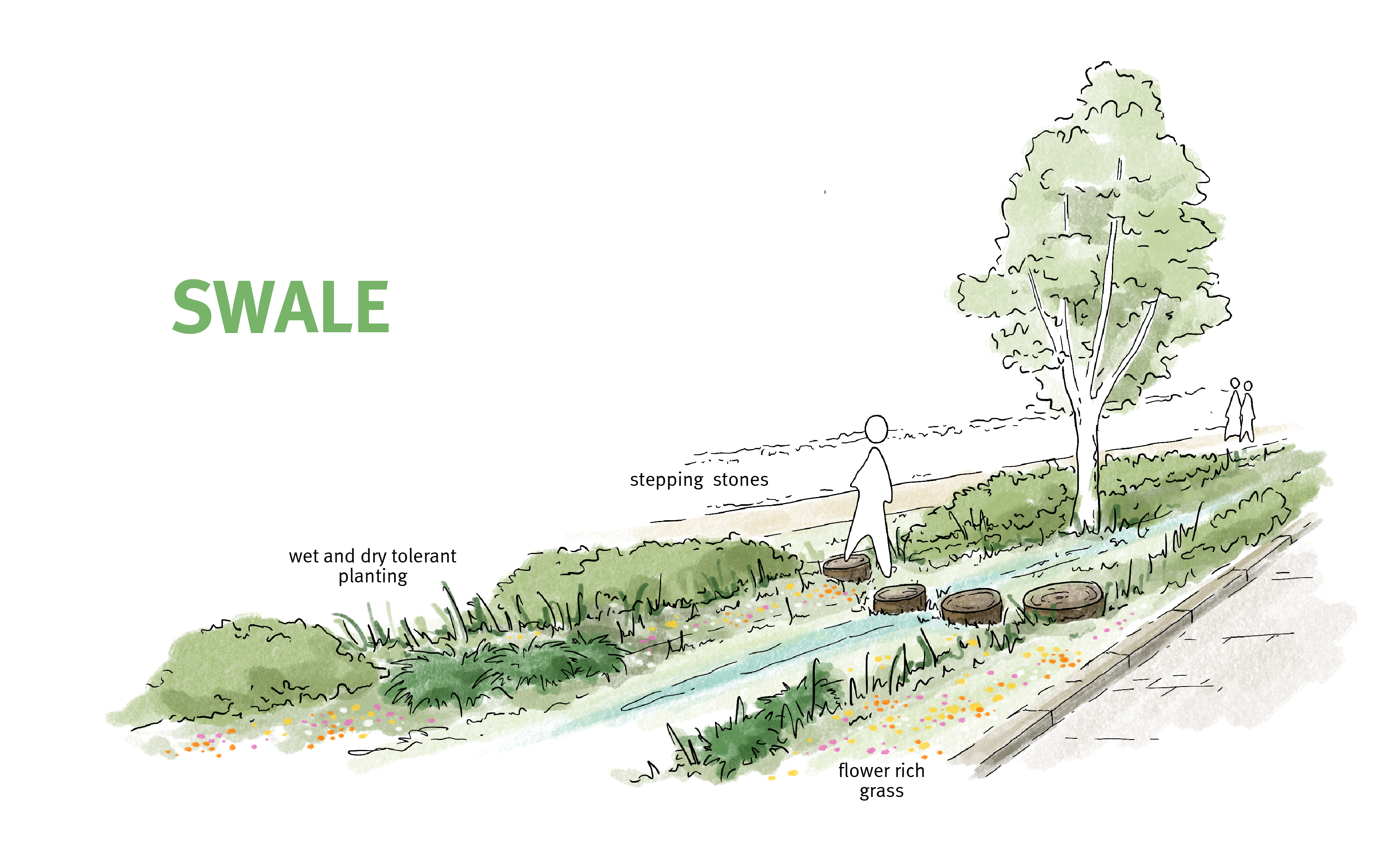 - Variations in topography to protect swales from insensitive mowing regimes. The maintenance plan may require reviewing to allow for less regular mowing.