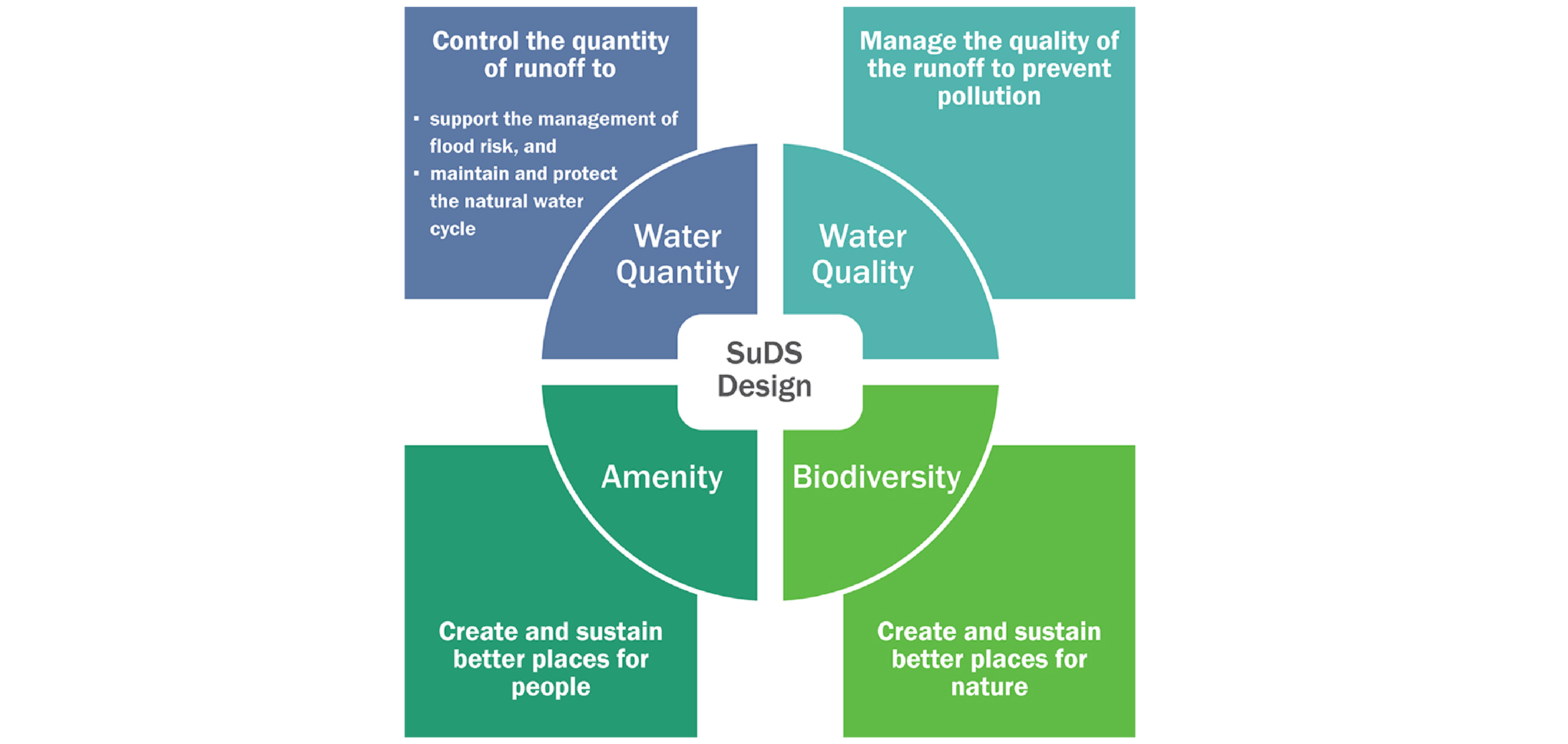 The CIRIA SuDS Manual C753 identifies that there are four main categories of benefits that can be achieved by SuDS: water quantity, water quality, amenity and biodiversity. In the past, water quantity and water quality have taken precedence over biodiversity and amenity when designing drainage systems for new developments. Good SuDS design delivers all four pillars of SuDS design. Biodiversity value can be delivered by even very small, isolated SuDS features such as tree pits and rain gardens, but the greatest value is achieved where SuDS are planned as wider green landscapes, as they can then help provide important habitat and wildlife connectivity.