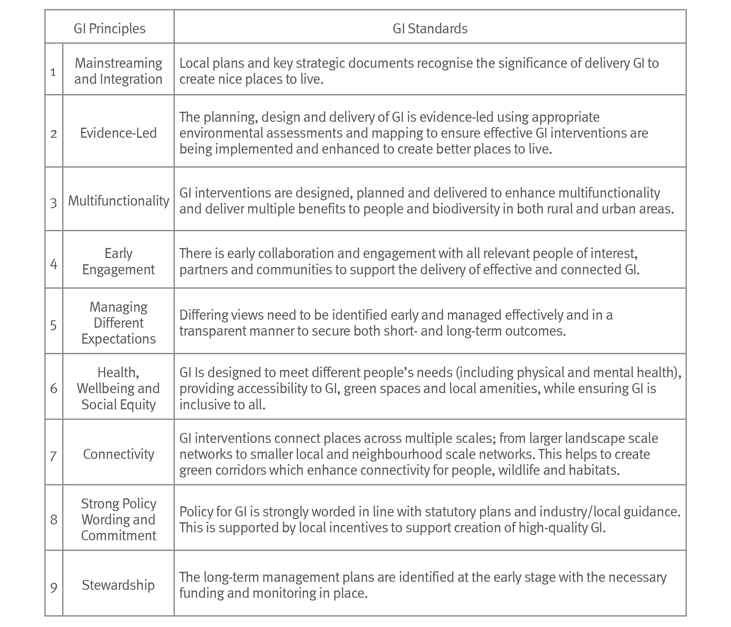 It is the intention of the Essex GI Standards to embed GI within new developments, retrofitting into our towns, cities and villages and for GI to become an integral part of the day-to-day considerations and decision making in other key sectors and services (i .e., health and wellbeing, highways etc.) to ensure that future planning, design, management and maintenance is clear, structured and focused. We need to move away from looking at GI in isolation, but towards a more joined-up, partnership approach which uses the resources we have to secure the greatest gains for the environment and the sustainable economy, as well as the health and wellbeing of its communities. In delivering the nine principles and standards together will ensure the delivery of high-quality multifunctional GI and the multiple benefits they provide. The order of nine principles and standards reflect the sequence and timescales for successfully planning, delivering and maintaining GI.