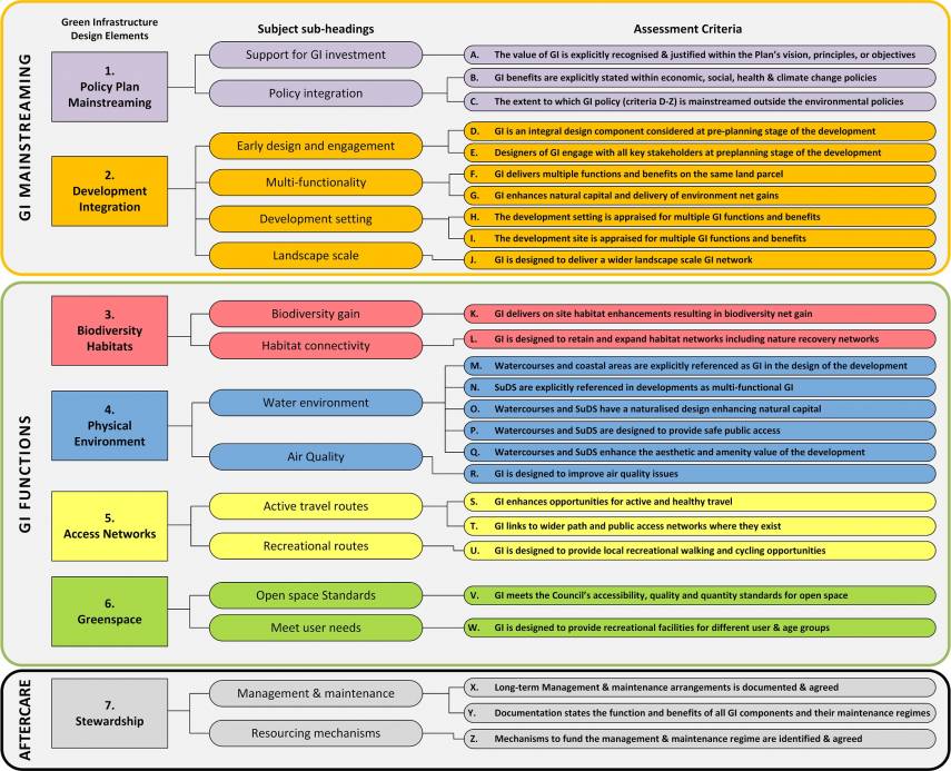 It is important for the GI designs in development proposals to be supported with the commitment to deliver on the ground. Site GI principles and standards should be embedded and referenced across application documents to ensure its multifunctionality and multiple benefits are not overlooked. This integration will clearly demonstrate the contributions of GI to natural capital, ecosystem services, biodiversity net-gain, climate change, flooding, health and wellbeing, sustainable transport and placemaking.