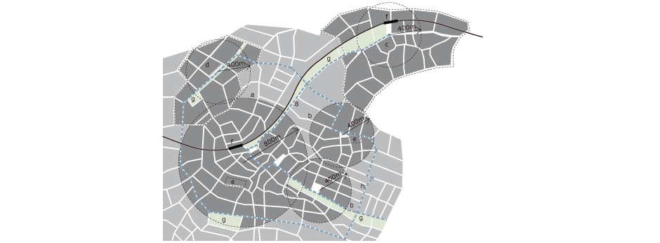 a. urban centre b. neighbourhoods/small urban centrep c. sustainable urban extension d. large urban infill e. small urban infill f. railway station g. green space h. bus route